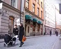 Many taverns from the 17th century are known in the street: Riga on Number 19; Holländska Dyn ("Dutch Slough") on Number 21; Förgylda Draken ("Gilded Dragon") on Number 27; Tre Kungar ("Three Kings") on Number 28; Sveriges Wapen ("Swedish Arms") on Number 29; and Stjärnan ("The Star") in the Rococo building on Number 45. Of all these taverns, only Den Gyldene Freden ("The Golden Peace") on Number 51 remains, but can hardly give a hint of the filth, stench, rows, and misery once hidden behind the romantic names.[2]