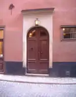 On either side of Number 37 are Lilla Hoparegränd ("Smaller Heaper's Alley", a corruption of "Hoper's Alley", e.g. hooper indicating a profession, 'maker of barrels') and Pelikansgränd ("Pelican's Alley"), both forking off from Gaffelgränd ("Fork alley"). While the building is standing on a medieval wall, the façade is from the 18th century, and the portal from the 17th century. The latter was probably cut by Johan Wendelstam, a German sculptor who arrived to Stockholm in 1641 to become the Guild Master within a few years, and also cut one of the portals on Stortorget. The client was apparently Dutch as the inscription on the gable stone reads: Gaet het wel men heeft veel vrinden kert het luck wie kan se vinden ("When luck stands by one have a lot of friends, but when luck turns where are they then?"). Behind the front door is an entrance hall featuring a richly profiled sandstone column carrying a cross-vault.[5][26] The façade of Number 24 dates back to 1862, the shutters and wooden panels from that time however replaced by the rough-cast plaster probably in 1945, and the windows enlarged since.[27] The rusticated façade of Number 26 dates back to the enlargement in 1846, at the time it was however perfectly symmetric, a balance manipulated in 1973 when the enlarged opening and wooden panel of the restaurant entrance was added. The northern door, still featuring some original details, gives a fair impression of what the façade looked like in the 19th century.[28] The façade of Number 28, arguably one of the oldest still existent residential properties in Stockholm, is mostly from 1874 with some details replaced in 1969.[29]