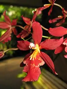 × Odontioda is a nothogenus of hybrid orchids, for plants produced by crosses between the genera Odontoglossum and Cochlioda. Typically they prefer intermediate temperatures, i.e. warmer temperatures than the mostly cool to cold growing parents, and indirect sunlight.[1] Often Cochlioda noezliana (Oncidium noezlianum) is a parent that inherits orange or red color. A famous early breeder of × Odontioda was Arthur Elle at Wichmann nurseries in Celle (Germany).