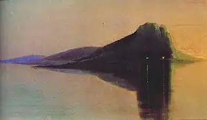 The memoirs of polar explorer and artist Nikolay Pinegin who saw the area when he was taking part in a 1913 polar expedition of Georgy Sedov say: "On the foggy days when we saw these headlands, they resembled the visions of the fantasy painter Čiurlionis". Latter writers attributed the naming to Pinegin.[2] A member of another expedition to the area, Vyacheslav Alekseyevich Markin, published a photo in his book, from which it can be concluded that the inspiration was the painting Stillness by Čiurlionis.[3][4][5] Vyacheslav Markin suggests the name of the bay, "Tikhaya" ("Still, "Quiet") was inspired by the name of the painting.[2]