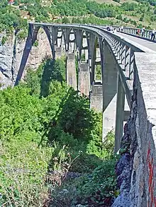 The Đurđevića Tara Bridge (Cyrillic: Мост на Ђурђевића Тари, pronounced [dʑǔːrdʑɛv̞iːtɕaː târa]) is a concrete arch bridge over the Tara River in northern Montenegro. It is located at the crossroads between the municipalities of Mojkovac, Pljevlja and Žabljak. The exact location of the bridge is between the villages of Budečevica and Trešnjica.