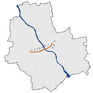 Łazienkowski Bridge (formerly the Zygmunt Berling Bridge) over the River Vistula is part of the route.[8]