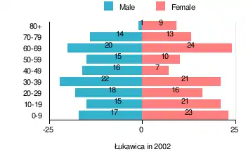 According to the 2002 Poland census, there were 282 people residing in Łukawica village, of whom 48.9% were male and 51.1% were female. In the village, the population was spread out, with 25.2% under the age of 18, 34.4% from 18 to 44, 13.8% from 45 to 64, and 26.6% who were 65 years of age or older.[1]