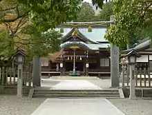 Following the Meiji restoration, the shrine was designated as a National Shrine, 2nd rank (国幣中社, kokuhei-chūsha) in 1871 under State Shinto's Modern system of ranked Shinto Shrines .[2] This qualified it for government support, and it was able to reconstruct most of its buildings in 1890.