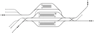 The station consists of three elevated island platforms serving six tracks, with the station building located underneath. Platforms 7 and 8 are situated at the western end of platforms 1 and 2, and platforms 9 and 10 are situated at the western end of platforms 3 and 4 respectively.
