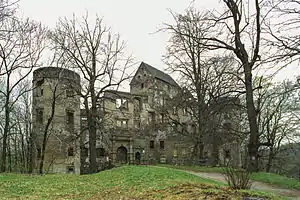 Świny Castle (Polish: Zamek Świny; formerly Schweinhausburg in German) - formerly a gord, as a stronghold existed in its location already in the fifth century - securing the Lubawecki mountain pass, the site was recorded in Cosmas' documents from 1108, where the gord is recorded as Suini in Poloniae.[1] Possibly, soon after, the gord had been expanded into a military stronghold, at which time it was the seat of the castellans. The castle was mentioned in Pope Adrian IV's Papal bull.[2] After the Bolków Castle was constructed, the castle began to lose its significance, this continued up to the nineteenth century, when the castle suffered severe damage due to hurricanes (1762, 1840, 1848, and 1868). The castle suffered further devastation - it was not until 1931 when the authorities had engaged in securing the castle's ruins. Currently the castle is privately owned.[3]