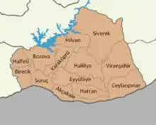 Şanlıurfa province is divided into 13 districts (capital district in bold), listed below with their populations as at 31 December 2021 according to the official government estimates:[7]