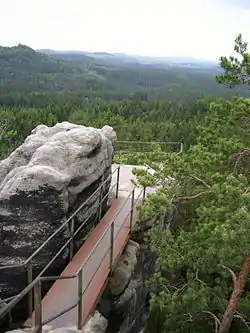Šaunštejn Castle (German: Schauenstein, also Hohenleipaer Raubschloss) is a rock castle near Vysoká Lípa (Hohenleipa) in the Bohemian Switzerland in the Czech Republic. Today only a few ruins remain of the original castle. Preserved are the foundations of the wooden superstructure, several rooms that were chiselled-out of the rock and the cistern.