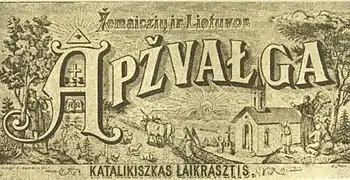 Žemaičių ir Lietuvos apžvalga (literally: Samogitian and Lithuanian Review, original spelling: Żemajczių ir Lietuwos Apżwałga), often abbreviated as Apžvalga, was a Lithuanian-language Catholic newspaper published in Tilsit, East Prussia, in 1889–1896.[1] At the time, Lithuanian press was banned and the newspaper had to be smuggled across the Prussia–Russia border. It promoted and supported the Lithuanian National Revival, but above all defended the Catholic faith. While it was fiercely anti-Tsarist publication when it came to religious and cultural topics, it was a socially conservative publication. It was replaced by a relatively more liberal Tėvynės sargas established in 1896.