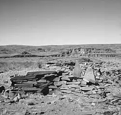 The site named ǁKhauxaǃnas refers to the fortified settlement atop the hill overlooking the Bak River. It consists of a trapezium-shaped walled-in enclosure of approximately 150 by 350 meters, and contains several ruins of buildings and kraals. Most of the dwellings are situated near the perimeter wall, which contains 23 doorways.[2] The settlement directly adjacent to the west is the Veldschoendragers Schans Vlakte village that was described by 19th century missionaries. It is equally uninhabited today and contains the ruins of a church that was designed to accommodate 300 people. While the fortification was built by piling sandstone slabs and fitting them together, mortar was used for the church walls.[3]