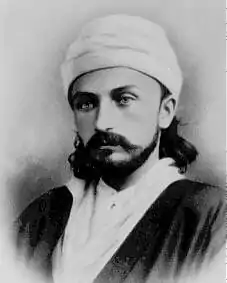 ʻAbdu'l-Bahá was described as handsome,[12] and bore striking resemblance to his mother. As an adult he reached medium height but he gave the impression of being taller.[115] He had dark hair that flowed to his shoulders, grey coloured eyes, a fair complexion and an aquiline nose.[116] In 1890, Orientalist Edward Granville Browne met him and wrote: