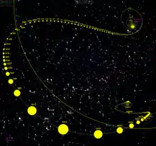 ʻOumuamua appears to have come from roughly the direction of Vega in the constellation Lyra.[52][53][58][59] Its incoming direction of motion is 6° from the solar apex (the direction of the Sun's movement relative to local stars), which is the most likely direction from which objects coming from outside the Solar System should approach.[58][60] On 26 October, two precovery observations from the Catalina Sky Survey were found dated 14 and 17 October.[61][50] A two-week observation arc had verified a strongly hyperbolic trajectory.[7][47] It has a hyperbolic excess velocity (velocity at infinity, ) of 26.33 km/s (94,800 km/h; 58,900 mph), its speed relative to the Sun when in interstellar space.[lower-alpha 4]