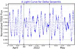 Delta Serpentis, Latinized from δ Serpentis, is a binary star system in the constellation Serpens, in its head (Serpens Caput). The light from the two stars in the system give a combined apparent magnitude of +3.80,[3] which is bright enough to be visible to the naked eye. Based on parallax measurements, it is located at a distance of approximately 230 light years from the Sun.[2] The system is moving closer with a radial velocity of ~42 km/s, and may come to within 115 light-years in 1.2 million years.[3]