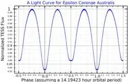 Epsilon Coronae Australis is an F4V dwarf star with an effective temperature of 6000 Kelvin. It ranges between apparent magnitudes of 4.74 to 5 over 14 hours,[10] an absolute magnitude of +2.45, and a mass of 1.1 solar masses. Epsilon Coronae Australis is a W Ursae Majoris variable, indicating that it has a contact companion within the Roche limit of the primary. The star is located at a distance of 30 pc (97 light years) from the Sun.[7] Yildiz and colleagues estimated the age of the system at 2.83 ± 0.28 billion years based on study of the properties of the system and estimated rate of mass transfer. They found the current masses of the primary and secondary to be 1.72 ± 0.04 and 0.22 ± 0.02 solar masses respectively, from their original masses of 1.06 ± 0.03 and 2.18 ± 0.06 solar masses.[11]