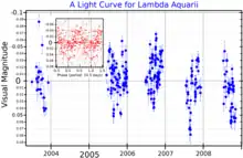 Lambda Aquarii, informally known as Hydor (/ˈhaɪdɔːr/),[11][12] is a variable star in the equatorial constellation of Aquarius. The name is Latinized from the Bayer designation λ Aquarii. The apparent visual magnitude of this star ranges from 3.57 down to 3.80,[3] which is bright enough to be visible with the naked eye. It lies just 0.39 degrees south of the ecliptic[13] and so is subject to lunar occultations.[14][15] The star is eclipsed by the sun from about 1-4 March;[16] thus the star can be viewed the whole night, crossing the sky, in early September, in the current epoch. Lambda Aquarii is located at a distance of approximately 310 light-years (95 pc) from the Sun based on parallax,[1] but is drifting closer with a radial velocity of −10.5 km/s.[6]