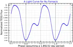 Nu Fornacis, Latinized from ν Fornacis, is a single,[13] variable star in the southern constellation of Fornax. It is blue-white in hue and faintly visible to the naked eye with an apparent visual magnitude that fluctuates around 4.69.[3] This body is located approximately 370 light years distant from the Sun based on parallax,[2] and is drifting further away with a radial velocity of +18.5 km/s.[7] It is a candidate member of the Pisces-Eridanus stellar stream, which suggests an age of 120 million years or less.[14]