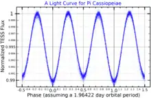 This is a double-lined spectroscopic binary system with an orbital period of nearly two days in a circular orbit.[8] It is classified as a rotating ellipsoidal variable star and its brightness varies by 0.02 magnitudes with a period of 23.57 hours,[5] which equals half of its orbital period. The spectrum matches that of an A-type main-sequence star with a stellar classification of A5 V.[3] The two stars have similar masses and spectra.[4] A star at a projected separation of 1,700 AU has been identified as a possible white dwarf. It is at the same distance as Pi Cassiopeiae and shares a common proper motion. The age of the white dwarf is calculated to be about 500 million years.[14]