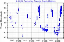 This star has a stellar classification of B2 IV-Ve,[3] indicating it is a Be star showing a mixed spectrum of a main sequence star and a subgiant. One of the most observed Be stars of the Southern Hemisphere,[14] Omega Canis Majoris is classified as a Gamma Cassiopeiae-type variable star.[2] Both the luminosity and the radial velocity vary with a primary cyclical period of 1.372 days.[15] The variation in brightness, ranging from magnitude +3.60 to +4.18,[2] shows changes over time, which suggests there are two overlapping periods of 1.37 and 1.49 days. The star also undergoes transient periodicities following outbursts.[16][10]