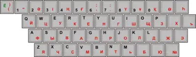 The standard Windows keyboard layout used for Cyrillic Kazakh in Kazakhstan is a modification of the standard Russian keyboard, with characters found in Kazakh but not in Russian located on the number keys.