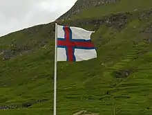 The flag of the Faroe Islands (in Faroese: Merkið) is an offset cross, representing Christianity. It is similar in design to other Nordic flags – a tradition set by the Dannebrog of Denmark,[1][2] of which the Faroe Islands are an autonomous territory.[3]