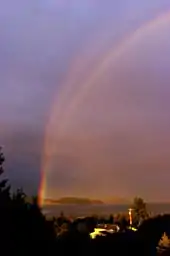 Unlike a double rainbow that consists of two separate and concentric rainbow arcs, the very rare twinned rainbow appears as two rainbow arcs that split from a single base.[29] The colours in the second bow, rather than reversing as in a secondary rainbow, appear in the same order as the primary rainbow. A "normal" secondary rainbow may be present as well. Twinned rainbows can look similar to, but should not be confused with supernumerary bands. The two phenomena may be told apart by their difference in colour profile: supernumerary bands consist of subdued pastel hues (mainly pink, purple and green), while the twinned rainbow shows the same spectrum as a regular rainbow. The cause of a twinned rainbow is believed to be the combination of different sizes of water drops falling from the sky. Due to air resistance, raindrops flatten as they fall, and flattening is more prominent in larger water drops. When two rain showers with different-sized raindrops combine, they each produce slightly different rainbows which may combine and form a twinned rainbow.[30] A numerical ray tracing study showed that a twinned rainbow on a photo could be explained by a mixture of 0.40 and 0.45 mm droplets. That small difference in droplet size resulted in a small difference in flattening of the droplet shape, and a large difference in flattening of the rainbow top.[31]