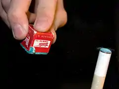 Cue tip chalk (invented in its modern form by straight rail billiard pro William A. Spinks and chemist William Hoskins in 1897)[11][12] is made by crushing silica and the abrasive substance corundum or aloxite[12] (aluminium oxide),[13][14] into a powder.[12] It is combined with dye (originally and most commonly green or blue-green, like traditional billiard cloth, but available today, like the cloth, in many colours) and a binder (glue).[12] Each manufacturer's brand has different qualities, which can significantly affect play. High humidity can also impair the effectiveness of chalk. Harder, drier compounds are generally considered superior by most players.