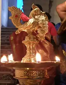 A diya, diyo, deya,[1] deeya, dia, divaa, deepa, deepam, deep, deepak or saaki (Sanskrit: दीपम्, romanized: Dīpam) is an oil lamp made from clay or mud with a cotton wick dipped in oil or ghee. These lamps are commonly used in the Indian subcontinent and they hold sacred prominence in Hindu, Sikh, Buddhist, and Jain prayers as well as religious rituals, ceremonies and festivals including Diwali.[2]