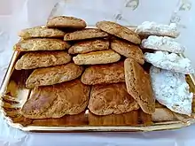 Historically, the cookies were made for the feast of Our Lady of the Letter, Saint Patron of the city of Messina, on June 3.[2] These cakes were originally prepared in the monastery of the Vincentian Sisters, and the name 'nzuddi derives from the abbreviation of the name "Vincenzo" (Vincent) in Sicilian language.[3][4]