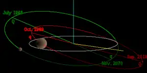 Like Pluto, Ixion's orbit is elongated and inclined to the ecliptic.[39] Ixion has an orbital eccentricity of 0.24 and an orbital inclination of 19.6 degrees, slightly greater than Pluto's inclination of 17 degrees.[2][39] Over the course of its orbit, Ixion's distance from the Sun varies from 30.1 AU at perihelion (closest distance) to 39.8 AU at aphelion (farthest distance).[2] Although Ixion's orbit is similar to that of Pluto, their orbits are oriented differently: Ixion's perihelion is below the ecliptic whereas Pluto's is above it (see right image). As of 2019, Ixion is approximately 39 AU from the Sun and is currently moving closer, approaching aphelion by 2070.[2] Simulations by the Deep Ecliptic Survey show that Ixion can acquire a perihelion distance (qmin) as small as 27.5 AU over the next 10 million years.[4]