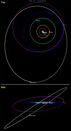 2013 FY27 orbits the Sun once every 449 years. It will come to perihelion around November 2202,[3][lower-alpha 2] at a distance of about 35.6 AU. It is currently near aphelion, 80 AU from the Sun, and, as a result, it has an apparent magnitude of 22.[1] Its orbit has a significant inclination of 33°.[3] The sednoid 2012 VP113 and the scattered-disc object 2013 FZ27 were discovered by the same survey as 2013 FY27 and were announced within about a week of one another.