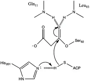 The transfer of malonate to acyl-carrier-protein (ACP) converts the acyl groups into thioester forms which are characteristic of acyl intermediates in fatty acid synthesis and which are strictly required for the condensation reactions catalyzed by β-ketoacyl-ACP synthetase.[4]