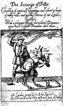 The literary convention that the satirist could wield a whip against "vice" was active at the period in other titles, such as The Whippinge of the Satyre (1601) by John Weever, against the excesses of satire, an anonymous work taken to be aimed at Marston and Jonson, among others. Nicholas Breton's No Whippinge, nor Trippinge: but a kinde friendly Snippinge was a reply of the same year, from another of the presumed targets of Weever.[26][27]