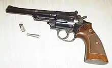 Developed jointly by Remington and Smith & Wesson, it was to be used in the Model 53 revolver, which first appeared late in 1961.[2] While it traced its origins to potent wildcats such as the .224 Harvey Kay-Chuk,[3] which ultimately derive from the .22 Hornet,[3] it was a bottlenecked cartridge based upon the .357 Magnum case necked down to a .22 caliber bullet, with an unusually long tapered shoulder.