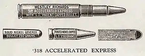 The .318 Westley Richards, also known as the .318 Rimless Nitro Express and the .318 Accelerated Express, is a proprietary medium bore centerfire rifle cartridge developed by Westley Richards.