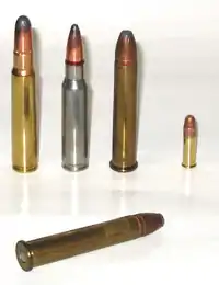 ![]() Photo of two .375 Winchester rifle cartridges with others for comparison. Left to right: 8mm Mauser, .308 Winchester, .375 Winchester, .22 Long Rifle. Foreground: .375 Winchester. | ||||||||||||||||||||