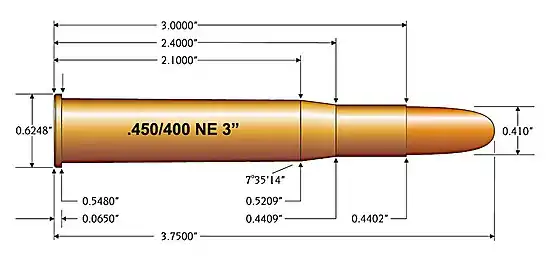 The .450/400 31⁄4-inch NE was recreated by loading the old .450/400 31⁄4-inch Black Powder Express with cordite, transforming a low-velocity deerstalking cartridge into a genuine big-game hunting round capable of tackling even the largest Indian and African game. The conversion was not initially entirely successful, under the increased pressures of the cordite loading the long neck could stick in the chamber causing the rim to pull off at extraction,[2] a problem not encountered with the milder black powder loadings. To counter this, W.J. Jeffery & Co reduced the length of the case to 3-inches and moved the neck further forward, creating this cartridge,[2] as such it was never loaded with black powder.
