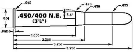 The .450/400 31⁄4-inch NE conversion was not initially entirely successful, under the increased pressures of the cordite loading the long neck could stick in the chamber causing the rim to pull off at extraction,[2] a problem not encountered under the milder black powder loadings. To counter this, the rim was increased in thickness to .042-inches. W.J. Jeffery & Co further improved the cartridge by reducing the length of the case to 3-inches and moving the neck further forward, creating the .450/400 3-inch NE.