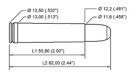 The .458×2-inch American is a straight, belted, .458 caliber (11.6 mm) big-bore cartridge designed by Frank Barnes. It is based on the .458 Winchester Magnum shortened to 2-inch (51 mm).[1]
