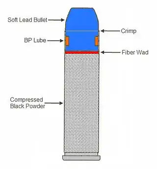 The .45 BPM can hold up to 60 grains of black powder.[2] A 60 grain cartridge configuration may be desirable to use as a novelty rifle cartridge such as for a revolver carbine.