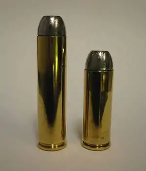 Since the .45 BPM is much longer than a .45 Colt cartridge a Colt Walker converted for .45 Colt cartridges will typically not chamber a .45 BPM. Again, this is because of the rebated internal design of the chambers as described previously. Therefore, the chambers of a Colt Walker conversion cylinder must be reamed to deepen them to the length of the .45 BPM casing. Any attempt to chamber a .460 S&W Magnum cartridge in a firearm not designed, tested, and certified for it is unsafe and should never be attempted. The .45 BPM is not a .460 S&W Magnum. The .45 BPM differs from the .460 S&W Magnum in several key areas. First, the .45 BPM is limited to a maximum C.O.L. (Cartridge Overall Length) of 2.140"[3] whereas the .460 S&W Magnum has a C.O.L. of 2.290". Second, the .45 BPM is a black-powder cartridge and can only contain either FFg or FFFg rated black powder. .460 S&W Magnum cartridges contain smokeless powder which generates pressures unsafe in firearms not designed for it including replica Colt Walkers. Third, the .45 BPM uses a large pistol primer whereas the .460 S&W Magnum uses a large rifle primer.