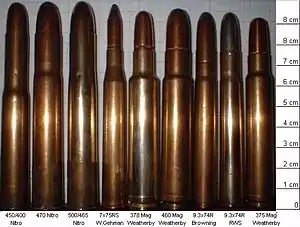 The .470 NE was originally designed by Lang's as a replacement for the .450 Nitro Express, after the .450 NE was banned in several British colonies including India in 1907 (its bullets could theoretically be removed from loaded rounds for use by natives in stolen .577/.450 Martini Henry rifles).[2] Due to the heavy bullet and powder charge, the gun has significant recoil but this is mitigated by the low velocity, resulting in recoil being delivered as a strong push rather than a violent blow. Rifles chambered for this cartridge tend to be heavy double-gun style, and are typically quite expensive.[3]