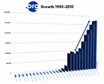In 2009, the .org domain consisted of more than 8 million registered domain names,[10] 8.8 million in 2010,[11] and 9.6 million in 2011.[12] The Public Interest Registry registered the ten millionth .ORG domain in June, 2012.[13] When the 9.5 millionth second-level domain was registered in December 2011, org became the third largest gTLD.[14]