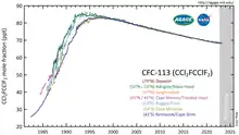 CFC-113 is a very unreactive chlorofluorocarbon. It remains in the atmosphere about 90 years,[5] sufficiently long that it will cycle out of the troposphere and into the stratosphere. In the stratosphere, CFC-113 can be broken up by ultraviolet radiation (where sunlight in the 190-225 nm (UV) range), generating chlorine radicals (Cl•), which initiate degradation of ozone requiring only a few minutes:[6][7]