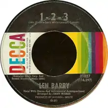 "1 - 2 - 3" is a 1965 song recorded by American blue-eyed soul singer Len Barry, who also co-wrote it with John Madara and David White (the latter two produced the recording). The recording's chorus and accompaniment were arranged by Jimmy Wisner. The single was released in 1965 on the American Decca label.[1][2] The writers were sued by Motown Records at the time, claiming that the song is a reworking of Holland-Dozier-Holland's "Ask Any Girl" released by The Supremes as the B-side to their single "Baby Love" the year before. They denied the claim, but after two years of litigation, agreed to give the Motown writers 15% of the song's writing and publishing royalties.[3] Holland-Dozier-Holland are listed as co-authors by BMI.[4]