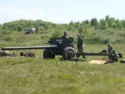 The M1977 can be also used as a field gun at brigade level, as it has a maximum range of 20.6 kilometers. After 1992, the M1977 anti-tank guns were modernized with improved optical sights.[2] The gun can be towed with the DAC 665T truck and has a maximum road speed of 60 km/h on road and 30 km/h off-road.