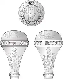![]() 100th Army Band Drum Major's baldric | ![]() 100th Army Band Drum Major's mace ![]() 100th Army Band herald trumpet's tabard | ![]() 100th Army Band snare drum design ![]() 100th Army Band unit tab | |