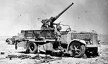 The 102/35 on SPA 9000, produced since 1914 and used during the Great War, was the first Italian gun truck, obtained from the installation on a truck of an anti-aircraft naval gun, designed for cruisers. After the end of the First World War, the trucks were disassembled and the guns were returned to Regia Marina.[1] In 1941 the Fiat Tripoli plant set up seven gun trucks on the chassis of the Fiat 634 N for the Regia Marina, using 102/35 S.A. (Schneider Ansaldo) guns taken from the defenses of Benghazi. With these means two mobile batteries were created, the 1st and 6th, served by personnel of the Maritime Artillery Militia of the Blackshirts, together with some old naval guns of type 76/30 already installed on the 634N trucks. The 1st Battery and a section of the 6th were joined to the 132nd Armoured Division Ariete,[2] while section B of the 6th was subordinated to the 102nd Motorised Division Trento.
