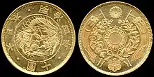 Ten yen coins were first issued in 1871 from a newly established mint at Osaka.[2] The origin of mintage is not clear as there are conflicting reports stating that ten yen coins were either minted in San Francisco, or in Japan the prior year.[3][4] In either case the unit of yen was officially adopted by the Meiji government in an act signed on June 27, 1871.[5] Under the new law each ten yen coin was to weigh 257.2 grains, and contain 90% gold with a foreign exchange rate close to a United States Eagle (US$10 coin).[6] Gold bullion for coinage was delivered from private Japanese citizens, foreigners, and the Japanese government.[7] No ten yen coins were minted between 1871 and 1876, during this time the Japanese government tried unsuccessfully to implement a gold standard with the amount of gold in circulation described as "very trifling". Gold bullion rose to a slight premium in 1874 which caused gold coin production as a whole to rapidly fall off. It was reported in the Quarterly Journal of Economics that by 1876 more gold coins were exported to foreign countries than for use domestically.[8] Japan was later forced off of the gold standard in 1877 due to the cost of the Satsuma Rebellion.[9] Twenty years would pass before the Japanese government went back on the gold standard. During this lapse non circulating ten yen gold coins were made in two non-consecutive years for two different reasons. The first occasion occurred in 1880 when ten yen gold proof coins were struck for exclusive use in presentation sets that were given away as gifts to foreign diplomats.[10][11] The second and final instance involved the World's Columbian Exposition in 1892 where several newly minted coins were put on display.[12]