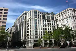 The Raleigh Hotel closed in 1954, and by 1965 developer Jerry Wolman had purchased the site and proposed building the current structure.[5] It was one of the first structures built under the Pennsylvania Avenue redevelopment plan approved in 1964,[6] and the first private building to be built.[7] Because of restrictions imposed by the Pennsylvania Avenue National Historic Site legislation, Wolman agreed to move the building line back from Pennsylvania Avenue by 50 feet (15 m) and keep the building's height to 135 feet (41 m), although in exchange for the loss of interior square footage District of Columbia zoning officials gave him permission to cantilever the building over the sidewalk on 12th Street at a height about 30 feet (9.1 m) above the street.[5][8] Named the Presidential Building (or the Presidential Office Building), the structure was designed by Edmund W. Dreyfuss & Associates in the Brutalist style.[6][9] Dreyfuss worked closely on the building with John Woodbridge, a staff architect for the President's Council on Pennsylvania Avenue and a member of the firm Skidmore, Owings and Merrill.[7] The President's Council chairman was Nathaniel A. Owings, a partner in that firm.[7] The building was completed in mid-1968,[1][2] and originally had 253,000 square feet (23,500 m2) of interior space.[6] Its address at this time was 415 12th Street NW.[6] The District of Columbia Public Schools leased seven of the floors in the building,[2] with other District government offices renting the remaining space.[6]