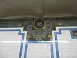 The walls along the platforms consist of a buff-colored brick wainscoting on the lowest part of the wall, and white glass tiles above. The platform walls are divided at 15-foot (4.6 m) intervals by blue tile pilasters, or vertical bands.[2]: 4 [7]: 10 The pilasters are topped by alternating blue-and-cream faience plaques of the number "116" and the Columbia University seal; both of these motifs are surrounded by faience wreaths. The seal shows a seated woman with a book of knowledge in her hand and three children standing near her feet. A blue-and-green cornice, made of faience, runs atop the wall and around the mosaic tablets.[2]: 4–5 [7]: 9–10 Mosaic wall tablets with the name "Columbia University" are installed along the platform walls.[2]: 5 [7]: 10 The mosaic tiles at all original IRT stations were manufactured by the American Encaustic Tile Company, which subcontracted the installations at each station.[56]: 31 The decorative work was performed by tile contractor John H. Parry and faience contractor Grueby Faience Company.[56]: 39